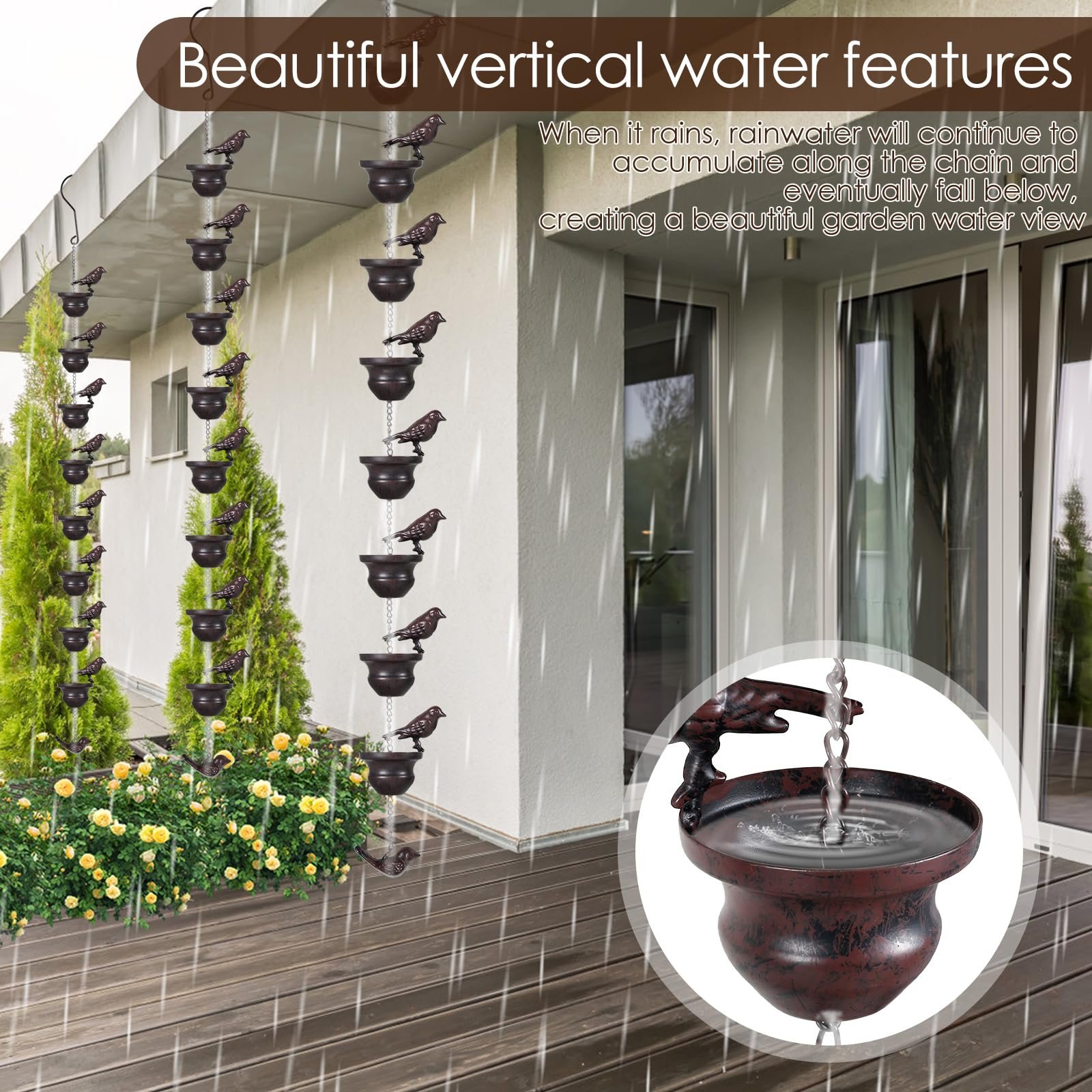 Relaxing Water Sound: When it rains, the rainwater will slowly flow down the chain, creating a soothing and peaceful feeling. It also adds exquisite beauty to your porch, balcony or patio, you can relax on a rainy day while admiring the beautiful water feature and enjoy a beautiful day.