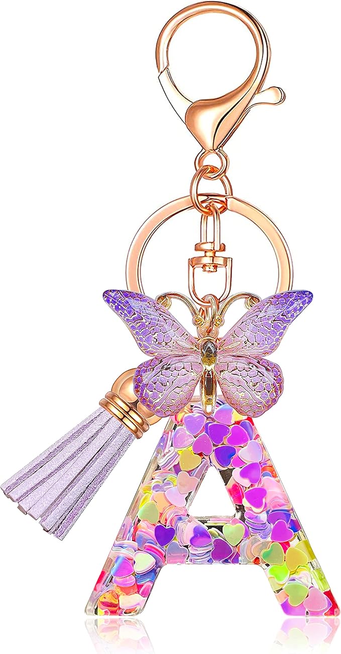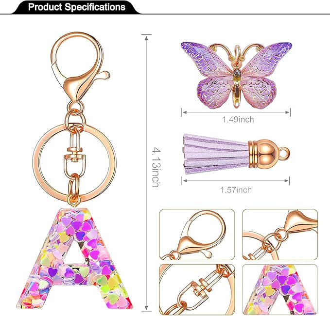 This cute pink butterfly tassel resin letter keychain is made of high-quality epoxy resin material, the keyring is made of high-quality rose alloy electroplating, and the resin letters are added with love sequins, very shiny, resin material High hardness, no deformation, no fracture.