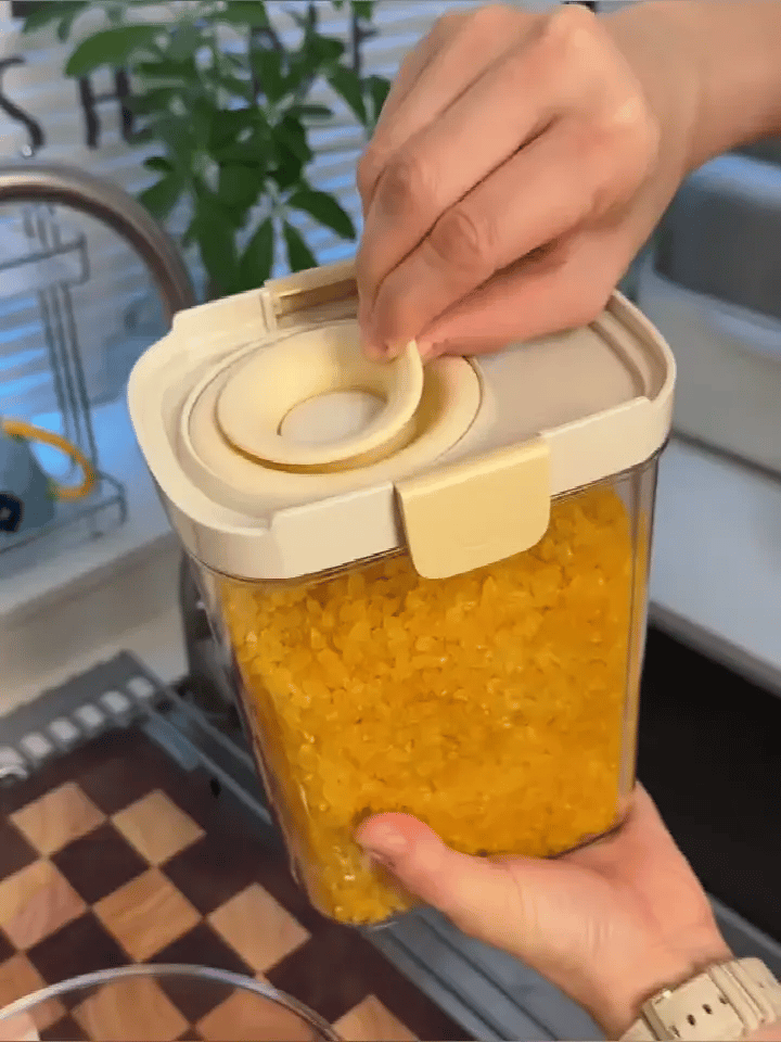 FOLDABLE SILICONE POUR SPOUT – The flexible silicone pour spout ensures easy, mess-free pouring of cereal, grains, or snacks without spills, and conveniently folds away when not in use to save space.