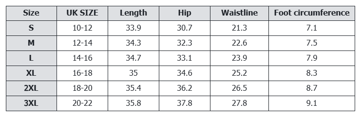 Size Chart for Non-Pocket Yoga Pants