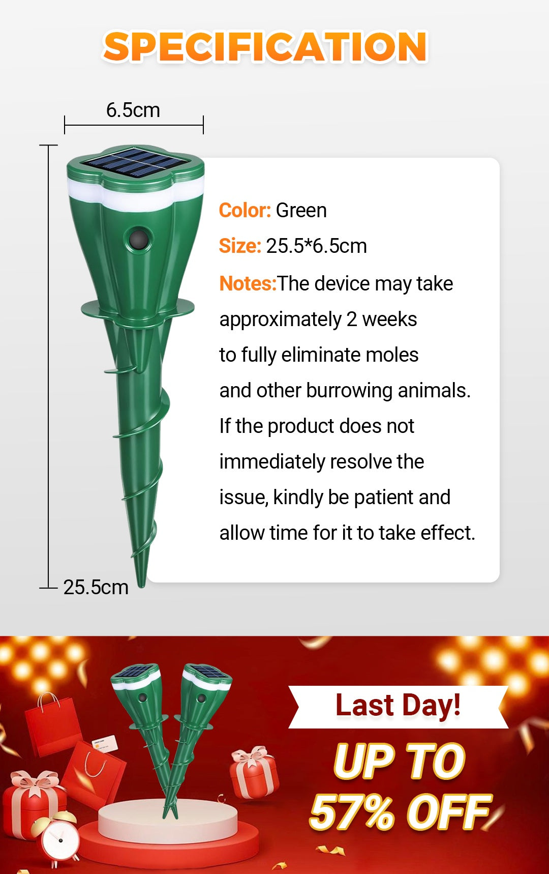The device may take approximately 2 weeks to fully eliminate moles and other burrowing animals. If the product does not immediately resolve the issue, kindly be patient and allow time for it to take effect.